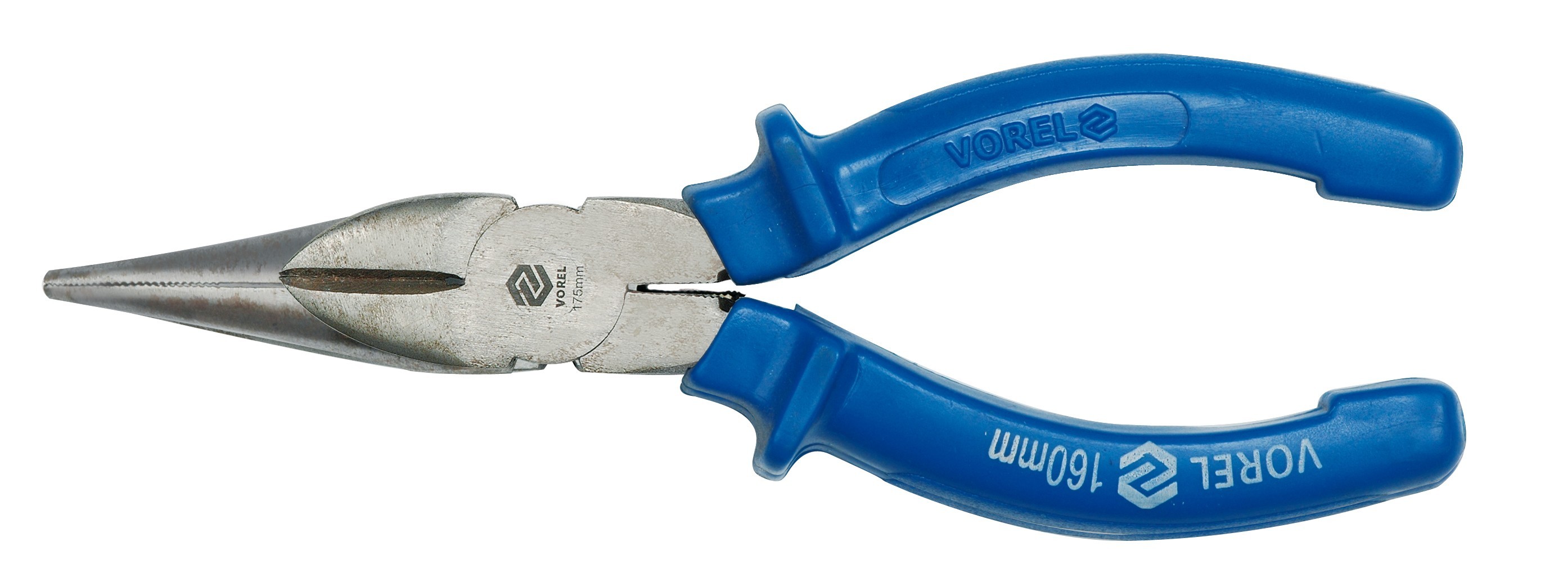 Prodloužené rovné kleště 160 mm. Povrch zoubkovaných čelistí s profilovanými břity pro střihání drátu a hřebíků. Rukojeti potažené pohodlnými plastovými kryty.
