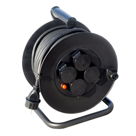 gumový kabel průřez vodičů: 3 x 1,5mm2 typ kabelu: H05RR-F3 tepelná pojistka lomená vidlice barva: černá délka: 25m zatížení: 5A/1150W navinutý 16A/3600W rozvinutý dětská ochrana kryty na zásuvkách vodě odolná ochrana: IP44