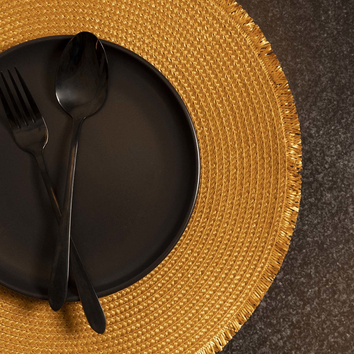 Prostírání má průměr 38 cm, což je dostatečné pro umístění velkého jídelního talíře, polévkové mísy nebo různých pokrmů, ve kterých se na něj u stolu servíruje jídlo. Díky originální struktuře a ozdobným střapcům je prostírání nejen praktické, ale také představuje další designový prvek do kuchyně nebo jídelny. Jeho hořčicová barva jistě oživí vaši jídelnu.