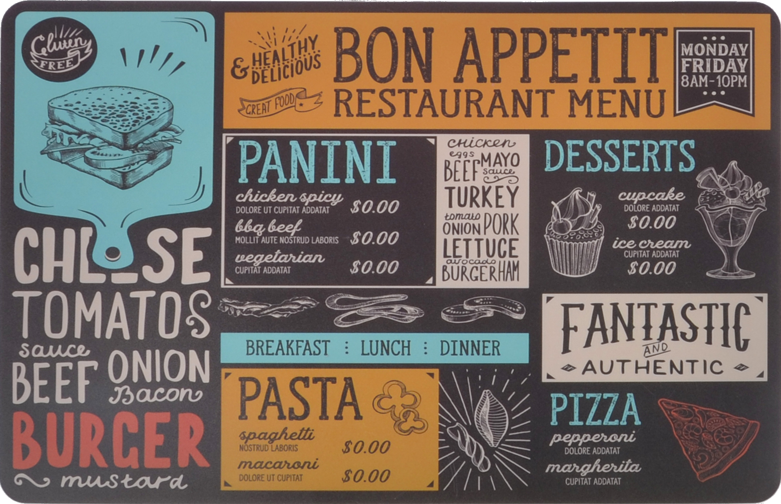Moderní prostírání je ukázkou kvalitního a kulturního stolování, které má jak estetický, tak praktický význam. Má omyvatelný povrch, chrání povrch stolu před znečistěním a snižuje hluk při pokládání talířů a příborů. Prostírání na jídelním stole vizuálně rozděluje prostor pro každého strávníka.Prostírání s moderním motivem z plastu o rozměrech 28x43 cm.