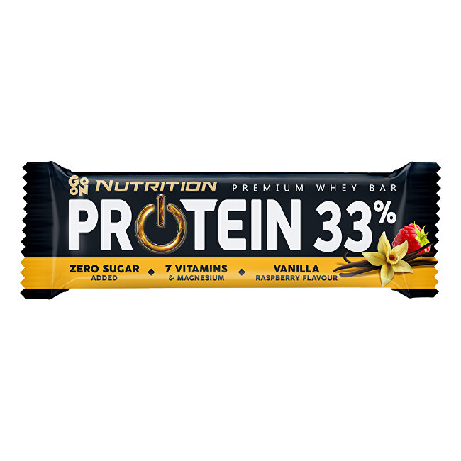 GO ON proteinová tyčinka je vynikající tyčinka s příchutí vanilky a maliny s vanilkovou polevou a obsahem 7 vitamínů a hořčíku. Hořčík obsažený v tyčince napomáhá udržet rovnováhu elektrolytu, řádnou svalovou funkci a přispívá k redukci únavy. GO ON proteinová tyčinka 33% je mimořádně křehká a má jemnou konzistenci. Je určena pro fyzicky aktivní osoby a sportovce, vhodná k užívání před, během i po cvičení. Výrobek obsahuje sladidla.