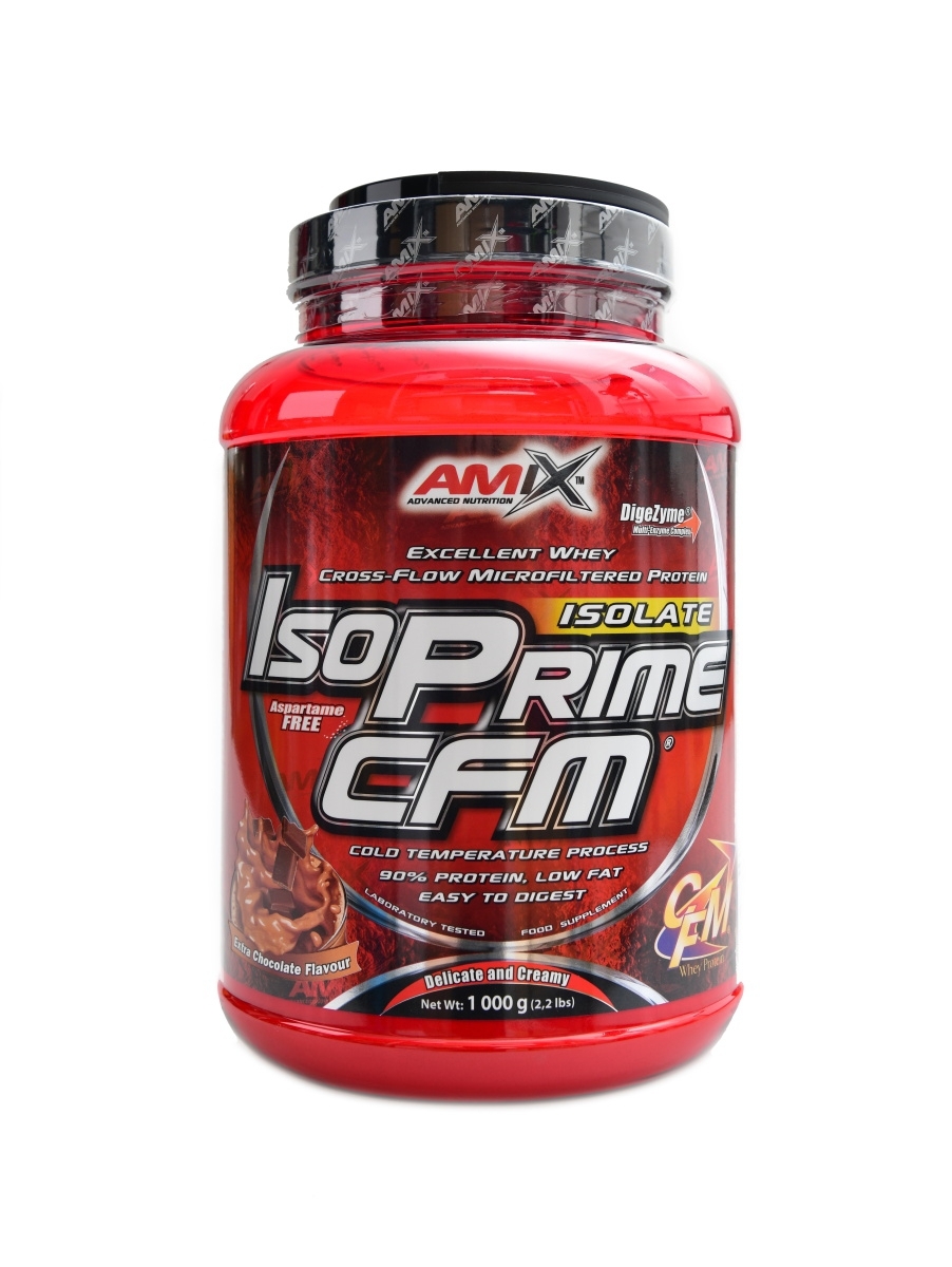 AmixTM IsoPure® CFM Whey Protein Isolate obsahuje 90% čistého proteinu vyrobeného tou nejšetrnější metodou mikrofiltrace CFM® - Cross-Flow Microfiltration. Tato metoda zaručuje maximální čistotu, lehkou stravitelnost a tu nejvyšší biologickou hodnotu syrovátkových bílkovin. Tento protein je jedinečný přirozeně vysokým obsahem aminokyselin BCAA, L-Argininu a L-Glutaminu. Neobsahuje Aspartam! Je slazen nekalorickou značkovou sukralózou Splenda®. Pro ještě lepší stravitelnost je obohacen v každé dávce originálním multi-enzymatickým komplexem DigeZyme®, který zvyšuje Enzymatickou kapacitu pro trávení a vstřebávání všech složek obsažených v tomto vysokoproteinovém produktu.