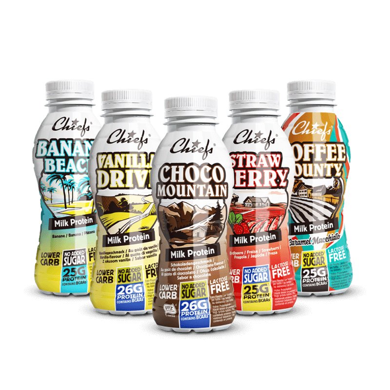 Vyvážené složení a velká dávka kvalitních syrovátkových bílkovin od "spokojených kraviček". Přírodní ochucování čokoládou nebo vanilkou a zcela BEZ LAKTÓZY. Chiefs se nezaleklo ani výzvy z pohledu cukru, nejenže do drinku žádný nepřidali (čímž by si rozhodně ulehčili práci a vylepšili prvoplánově chuť), ale přirozené množství cukru v drinku díky šetrným postupům snížili. Proto je v nápoji pouhých 7,6-8,9g uhlohydrátů dle příchutě.