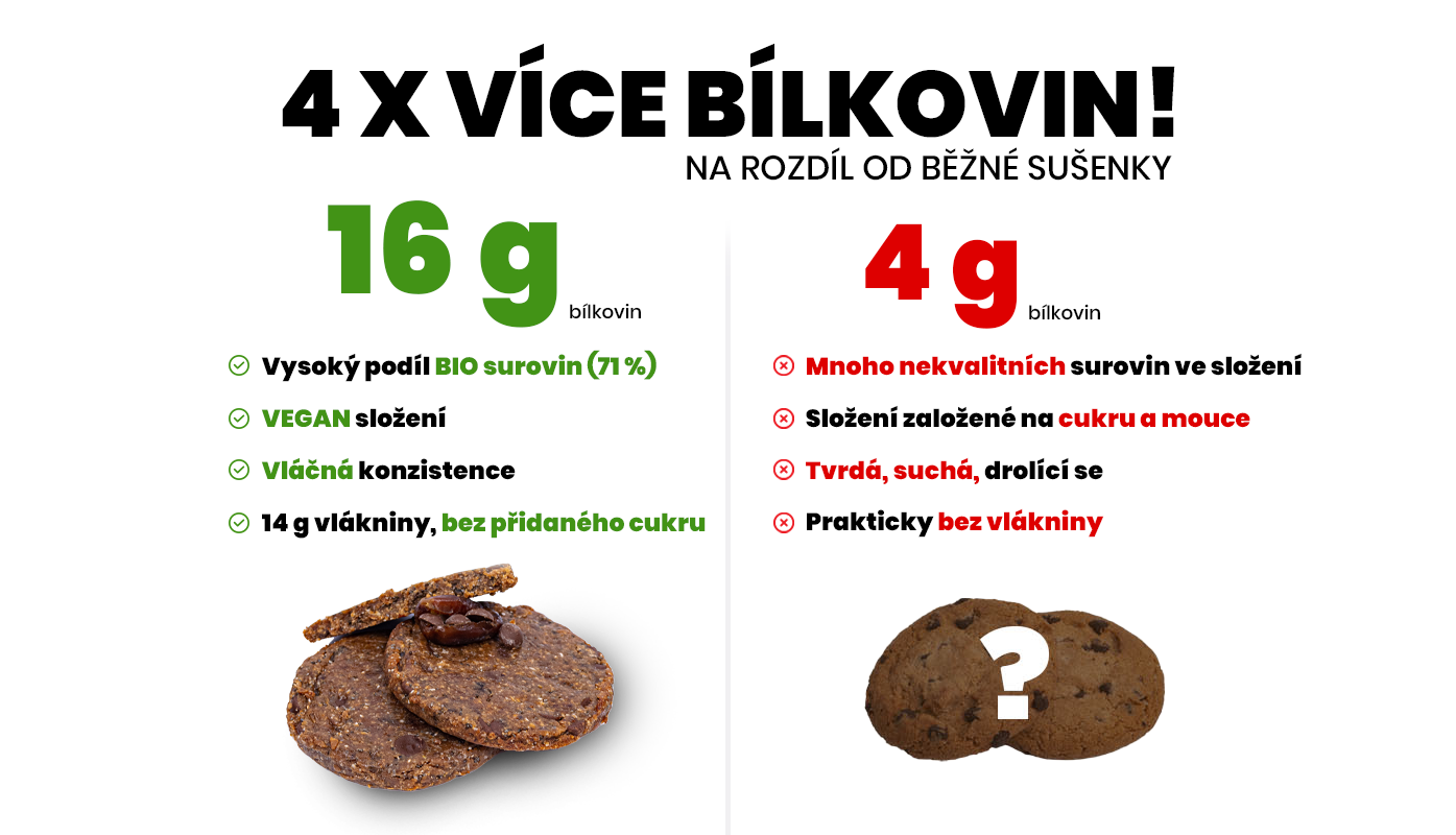 Při výrobě BrainMax potravin vždy přemýšlíme nad tím, jak spojit chuť a excelentní výživovou hodnotu. Tato cookieska je 100% rostlinného původu a je důkazem, že i vegan produkty mohou být vynikající nutričně i chuťově.