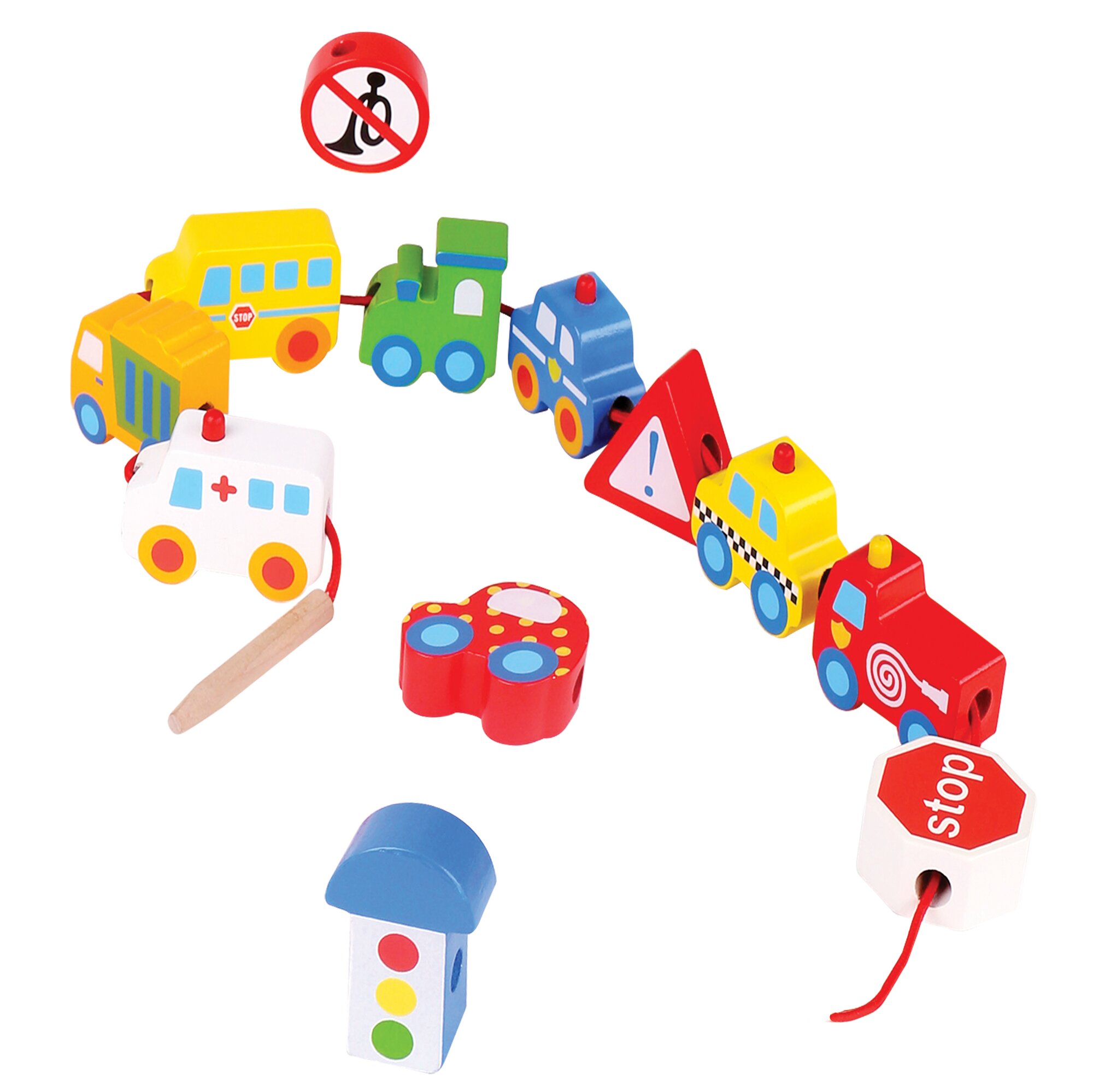 Drevené dieliky v podobe dopravných prostriedkov a dopravného značenia padnú ako uliate do malej ručičky. Deti môžu dieliky navliekať, ale tiež počítať, či učiť sa na nich farby. Vďaka svojej variabilite je hra vhodná už pre deti od 12 mesiacov. Okrem 12 rôznorodých dielikov na prevliekanie, nájdete v balení aj šnúrku s dreveným koncom, vďaka ktorej pôjde deťom navliekanie ako po masle.