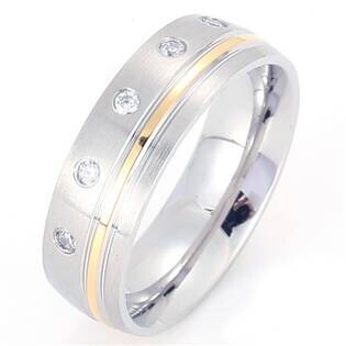 Ocelový prsten zdobený zlaceným proužkem a zirkony čiré barvy