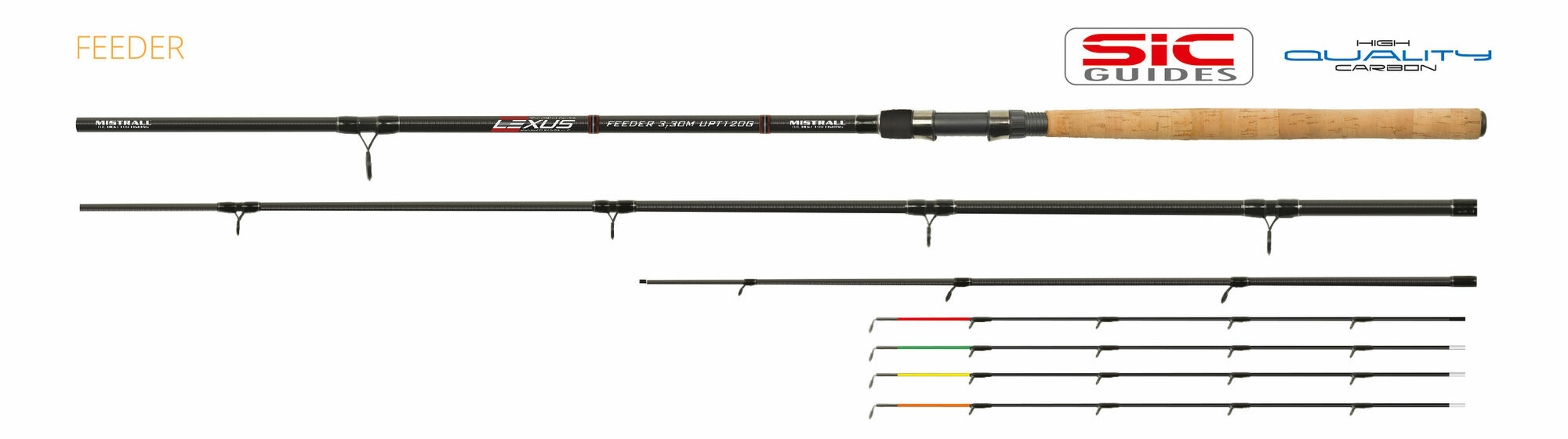 Feederový prut s korkovou rukojetí, je dokonale vyvážený a je osazen SIC očky.