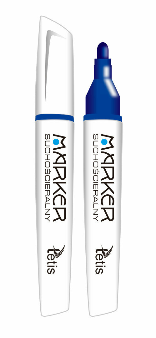 Suchościeralny, niebieski marker od firmy TETIS. Jest szybkoschnący i łatwy do starcia z większości powierzchni. Tusz jest nietoksyczny, wykonany na bazie alkoholu. Dzięki trójkątnemu, ergonomicznemu wyprofilowaniu dobrze trzyma się go w dłoni, co zapewnia komfort pisania. Pisak posiada zatyczkę.Cena za 1 sztukę (1 marker).Grubość linii pisania: 3mmKońcówka: stożkowaOpakowanie zbiorcze: pudełeczko z nadrukiemWymiary opakowania zbiorczego: 11x4x14cm