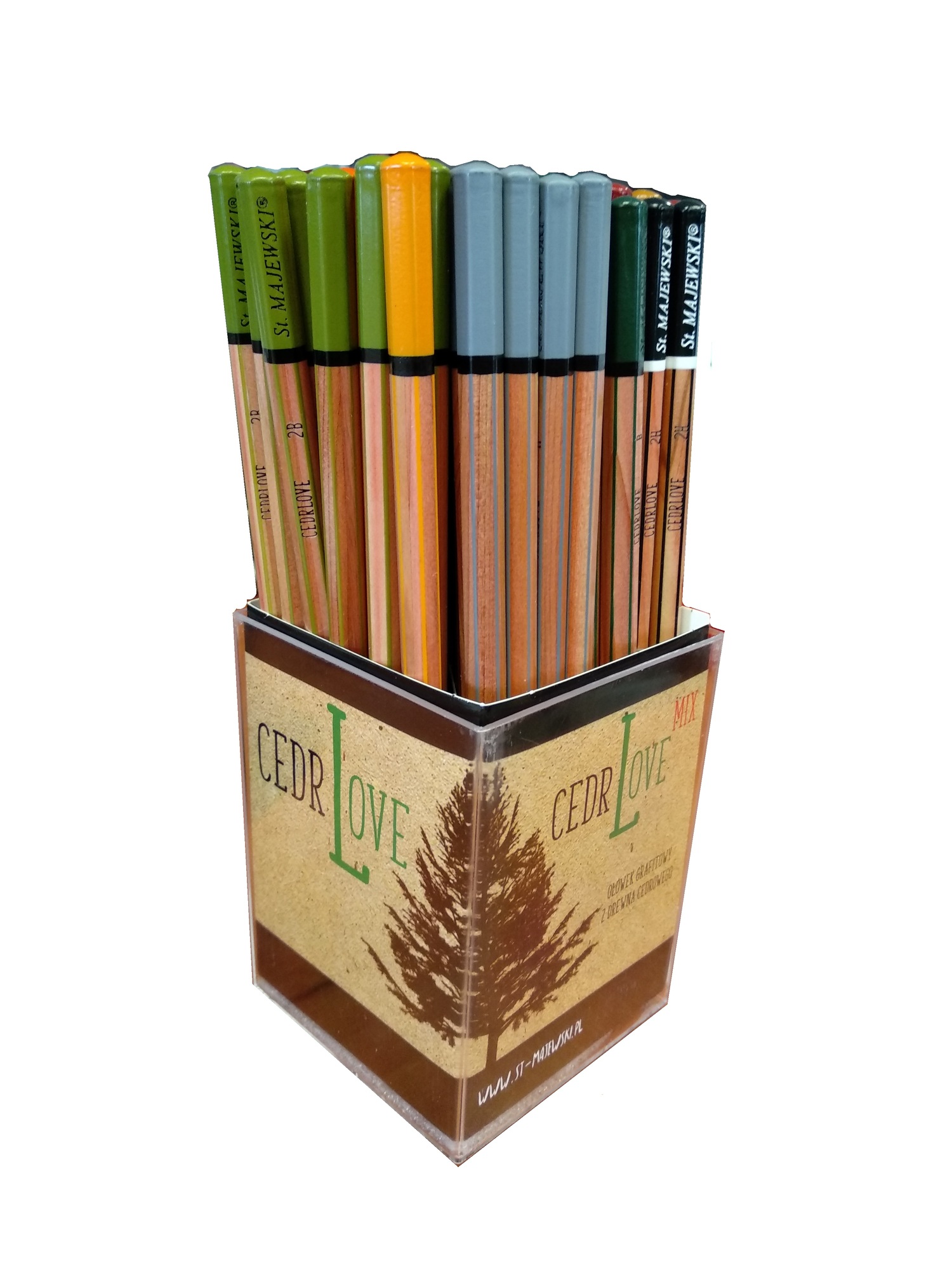 Ołówki z drewna cedrowego MIX, 72 sztuki, CedrLoveOłówki techniczne z serii CedrLove to profesjonalnie wykonane narzędzie piśmiennicze, które sprawdzi się w użytku biurowym, domowym oraz szkolnym. Wysoka jakość wykonania ołówków oraz zastosowana technologia SBS, zabezpieczająca grafit przed łamaniem, usatysfakcjonuje zarówno początkującym jak i doświadczonym rysowników.Cechy charakterystyczne: wykonane z drewna cedrowego technologia SBS (Special Bonding System) zabezpieczająca grafit przed łamaniem twardości grafitu w ekspozytorze: 2B, 2H, 3B, 3H, 4B, 4H, 5B, 5H, 6B, 7B, 8B, 9B, B, H, HB przekrój heksagonalny wysoka czystość grafitu lakierowane końcówki wskazujące na twardość grafitu nowoczesny design