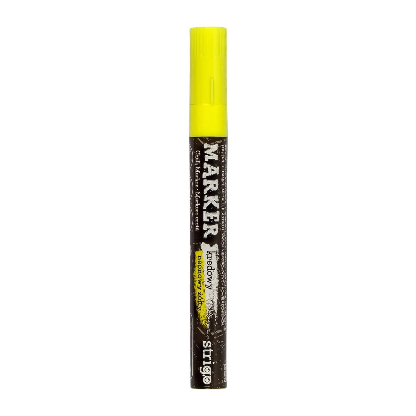 Marker kredowyStrigo w kolorze neonowym żółtym to idealna propozycja do pisania po czarnych tablicach nowego jak i starego typu, potykaczach, szkle, plastiku i innych gładkich powierzchniach.Odporny na działanie warunków atmosferycznych.Tusz na bazie wody, usuwalny za pomocą mokrej gąbki.Nie rozmazuje się i nie niszczy powierzchni.Dzięki miękkiej, zaokrąglonej końcówce wykonanej z fibry pisanie nim jest niezwykle wygodne.Zapewnia czyste i precyzyjne pisanie. Bezwonny, nie zawiera xylenu ani toluenu.Szerokość końcówki piszącej 8 mm.Dostępny w 7 kolorach: neonowym: żółtym, pomarańczowym, różowym, zielonym oraz jasnoniebieskim, czerwonym i białym.