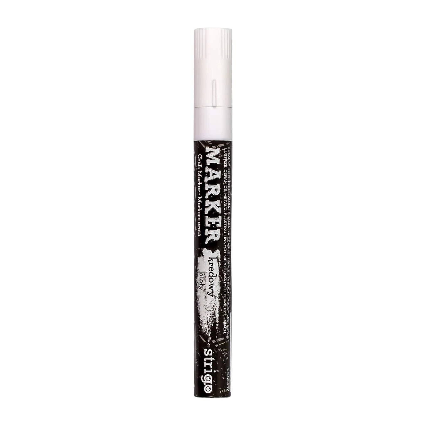 Marker kredowyStrigo w kolorze białym to idealna propozycja do pisania po czarnych tablicach nowego jak i starego typu,potykaczach, szkle, plastiku i innych gładkich powierzchniach.Odporny na działanie warunków atmosferycznych.Tusz na bazie wody, usuwalny za pomocą mokrej gąbki.Nie rozmazuje się i nie niszczy powierzchni.Dzięki miękkiej, zaokrąglonej końcówce wykonanej z fibry pisanie nim jest niezwykle wygodne.Zapewnia czyste i precyzyjne pisanie. Bezwonny, nie zawiera xylenu ani toluenu.Szerokość końcówki piszącej 4mm.Dostępny w 7 kolorach: neonowym żółtym, zielonym, pomarańczowym, różowym, oraz jasnoniebieskim, czerwonym i białym.