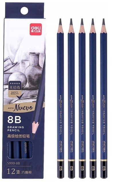 Ołówki do szkicowania 8B Nuevo DELI.Wysokiej jakości ołówki rysunkowe z serii artystycznej Nuevo.Wykonane są one z dbałością o każdy detal z wyselekcjonowanego drewna lipowego.Wkład ołówka wykonany jest z grafitu o wysokiej zawartości węgla i drobnych ziaren, co zapewnia płynne i precyzyjne rysowanie, a jednocześnie minimalizuje ryzyko złamania wkładu.Ołówki posiadają certyfikat EN 71-3, co oznacza, że są bezpieczne nawet dla najmłodszych użytkowników.Ich hexagonalny kształt doskonale dopasowuje się do dłoni, dzięki czemu zapewniają wygodne i stabilne prowadzenie rysunku.Ołówki z serii Nuevo znajdują zastosowanie w wielu dziedzinach, takich jak grafika, rysunek techniczny, plastyka, szkoła, biuro oraz codzienne użytkowanie.- w zestawie znajduje się 12 ołówków.