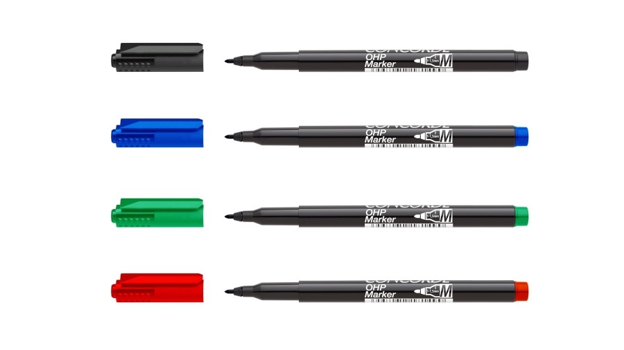 Sada 4 ks permanentních popisovačů vhodných pro popis průsvitných folií, skla, umělé hmoty apod. Neprůhledný inkoust. Odolné proti vodě, smazatelné pouze pomocí lihu. Šíře stopy 1-1,5mm (M).