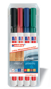 Sada 4 barev permanentního popisovače s kulatým hrotem a slabým zápachem. Znovunaplnitelný inkousty T 25, T 100 a T 1000. Stopa 1 mm.