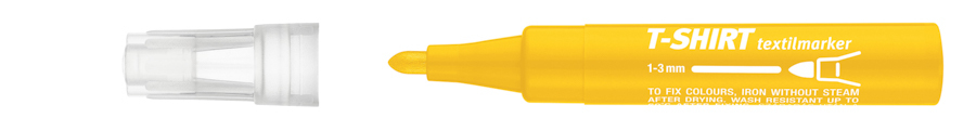 Žlutý popisovač na textil s kulatým hrotem. Šíře stopy 1-3 mm. Pro fixaci barev je nutné zažehlení (bez páry). Je vhodný pro popisování téměř všech druhů textilních materiálů, odolný proti praní.