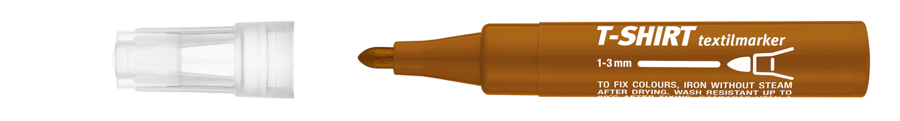 Hnědý popisovač na textil s kulatým hrotem. Šíře stopy 1-3 mm. Pro fixaci barev je nutné zažehlení (bez páry). Je vhodný pro popisování téměř všech druhů textilních materiálů, odolný proti praní.