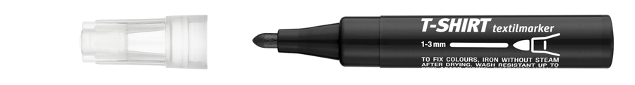 Černý popisovač na textil s kulatým hrotem. Šíře stopy 1-3 mm. Pro fixaci barev je nutné zažehlení (bez páry). Je vhodný pro popisování téměř všech druhů textilních materiálů, odolný proti praní.
