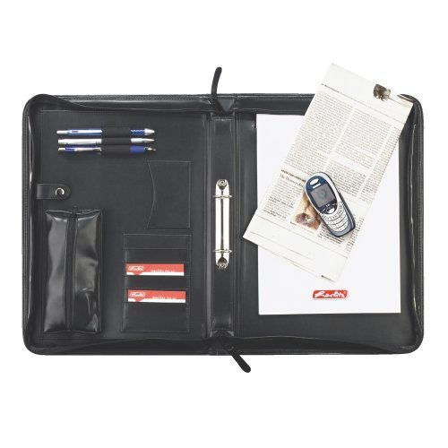 černá koženka, s uchem, dvoukroužková mechanika, blok A4, přihrádky na kreditní karty, poutka na psací potřeby, kapsa na zip číst celé