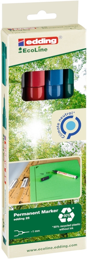 Permanentní popisovač edding 25 z ekologické řady EcoLine má tělo vyrobené nejméně z 90 % z recyklovaných materiálů. Je vhodný pro popis téměř všech materiálů (sklo, umělá hmota, kov, papír, karton, dřevo). Rychleschnoucí, světlostálý, voděodolný a otěru odolný inkoust na alkoholové bázi neobsahuje toluen ani xylen. Fix je znovu naplnitelný (náhradní inkoust edding MTK25, T 25, T100, T1000) a jeho hroty jsou vyměnitelné. Možnost naplnění vypsaného zvýrazňovače i možnost výměny hrotu pomáhá snižovat množství kancelářského odpadu. Uplatnění ve výrobě, ve skladech, v logistice, v kancelářích, v domácnostech, na zahradách i v dílnách. Využití v interiéru i exteriéru. Prodloužením životnosti popisovače pomůžete snížit množství komunálního odpadu. Klimaticky neutrální produkt podle ClimatePartner (ID 13742-1910-1001). Sada 4 barev. Kulatý hrot. Šíře stopy: 1 mm. Vyrobeno v Německu.