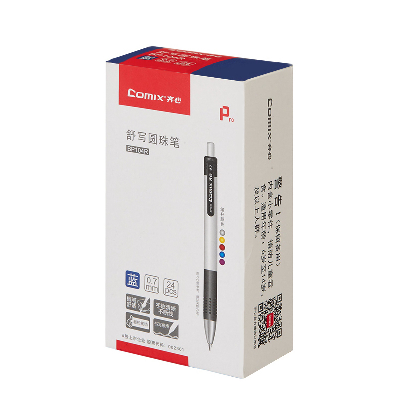 Kuličkového pero Economy Comix BP104R (24ks) s pogumovaným úchopem, díky kterému využijete komfortní použití, které zabraňuje napětí a křeči při dlouhodobém psaní. Klasické mechanicky zatahované pero 0.7mm s modrou náplní.