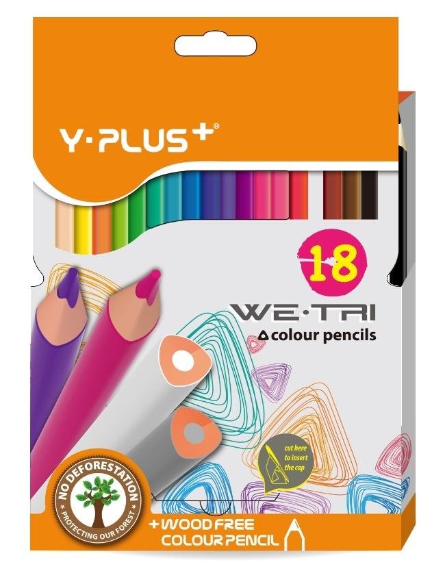 Kredki bezdrzewne - 18 sztuk. Wygodne do postawienia i użytkowania pudełko-stojak z miejscem na imię i nazwisko dziecka.