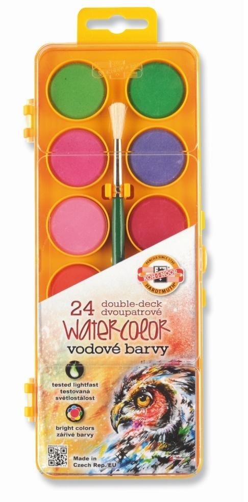 Farby akwarelowe zapewniające intensywne, trwałe kolory o wysokiej sile krycia. Zapewniają doskonałe efekty na papierze oraz kartonie.Komplet farb w plastikowym podwójnym opakowaniu zawierającym 24 kolory.Komplety zawierają pastylki o średnicy 30mm.