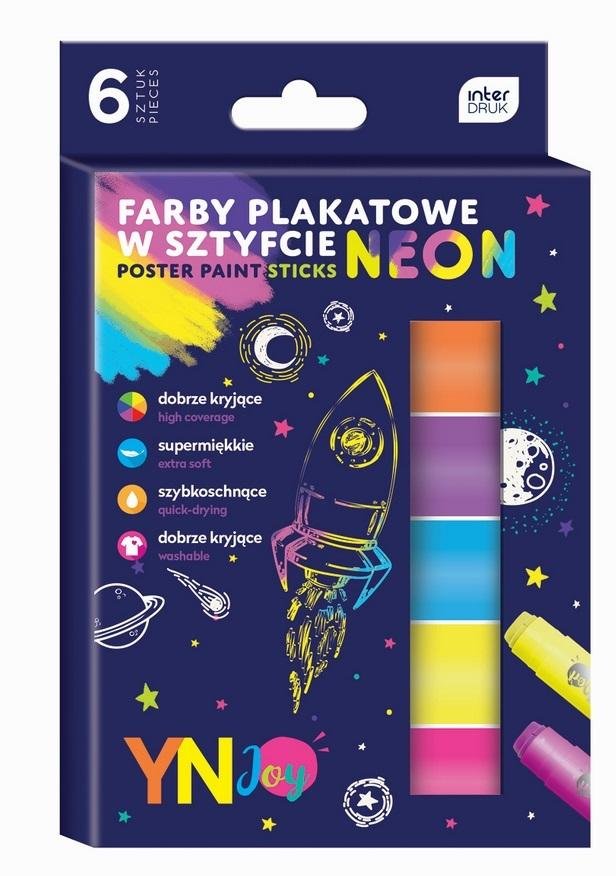 Farby plakatowe w sztyfcie w 6 neonowych kolorach.Dobrze kryjące, supermiękkie, szybkoschnące oraz łatwospieralne.