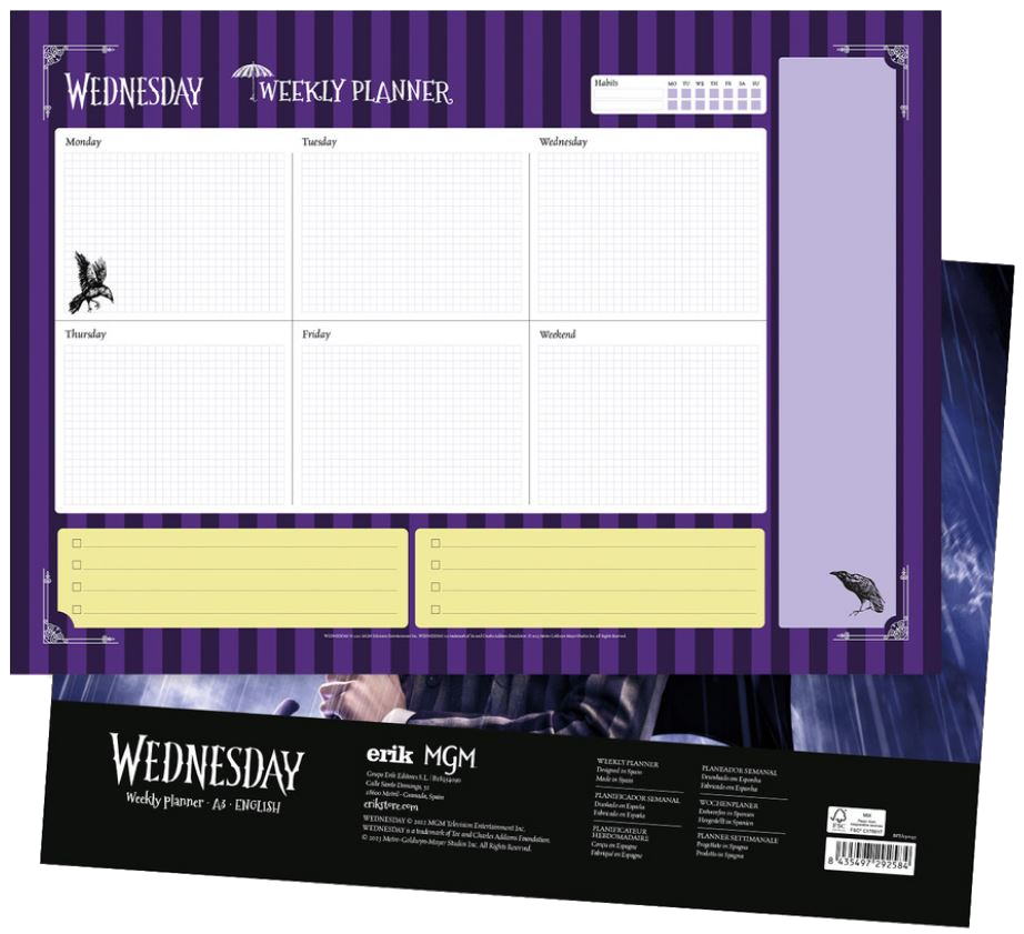 Stolní týdenní plánovací blok s 54 listy inspirovaný seriálem Wednesday. Vhodné také jako podložka na psací stůl.