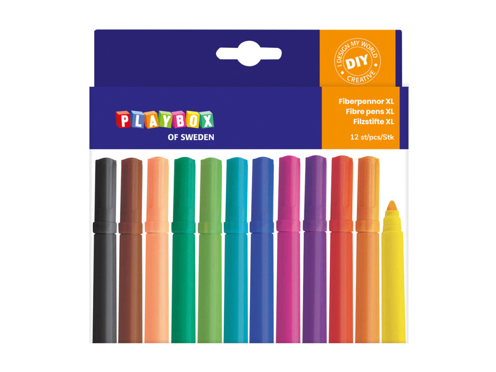 Balení obsahuje 12 ks vláknových fixů (černá, hnědá, tělová, tm. zelená, sv. zelená, sv. modrá, tm. modrá, růžová, fialová, červená, oranžová, žlutá).