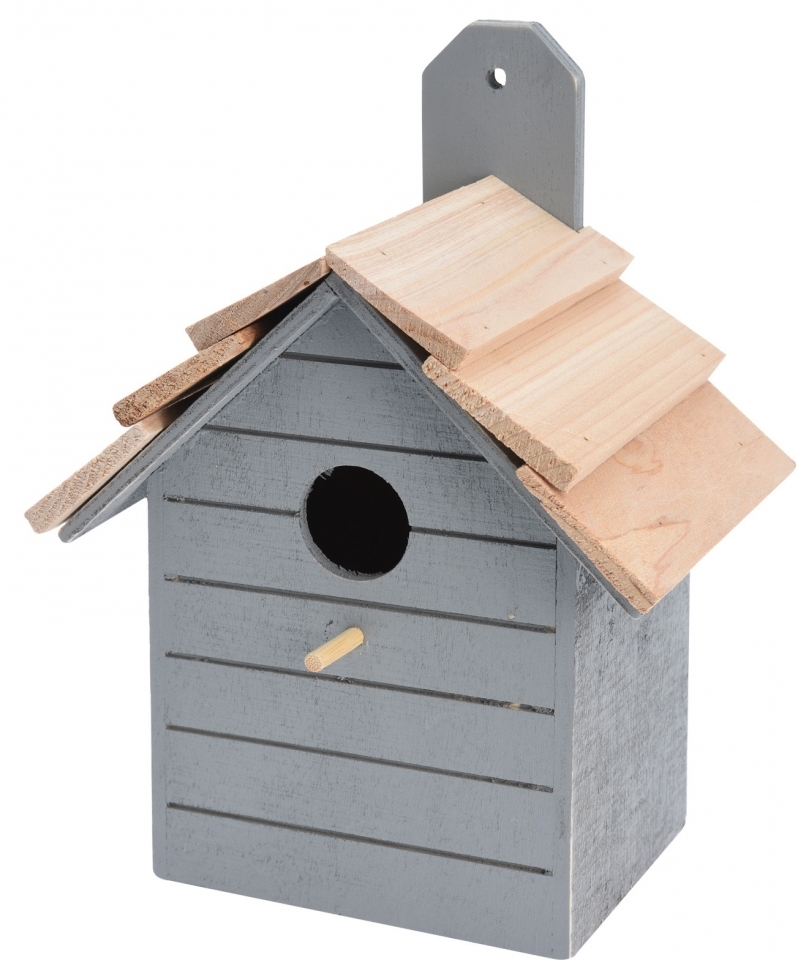 Dekorativní dřevěná ptačí budka na zavěšení.