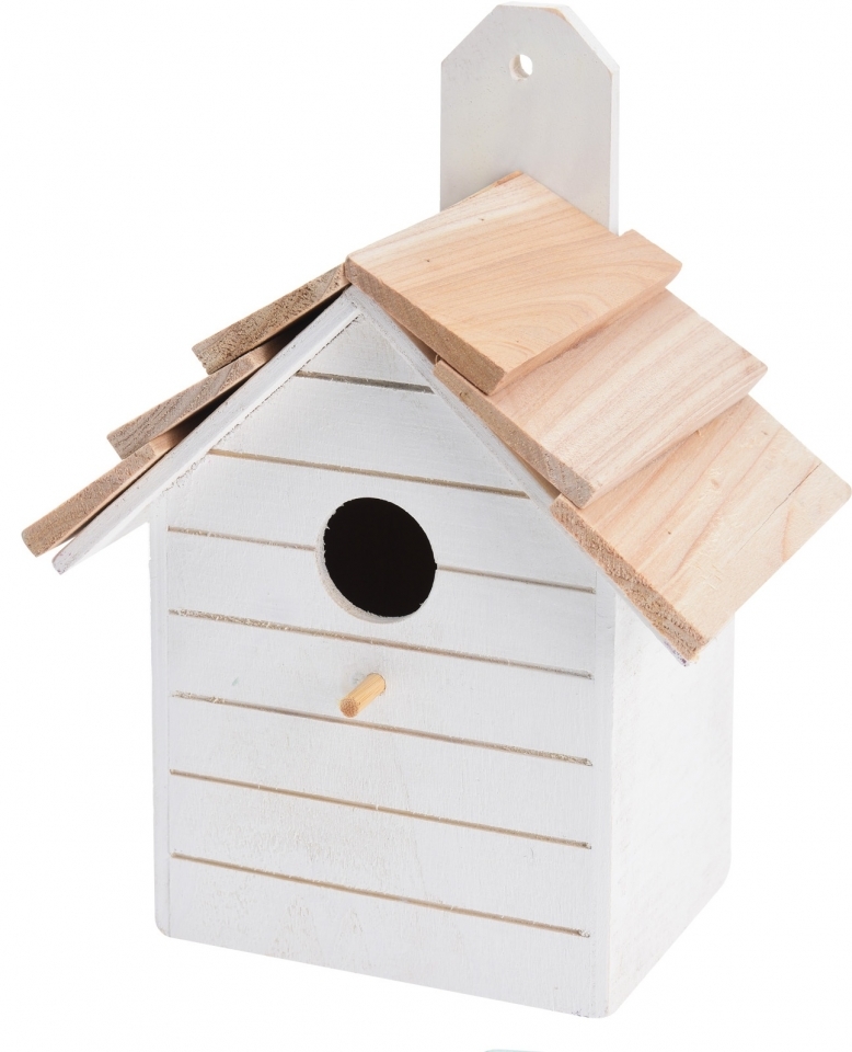 Dekorativní dřevěná ptačí budka na zavěšení.