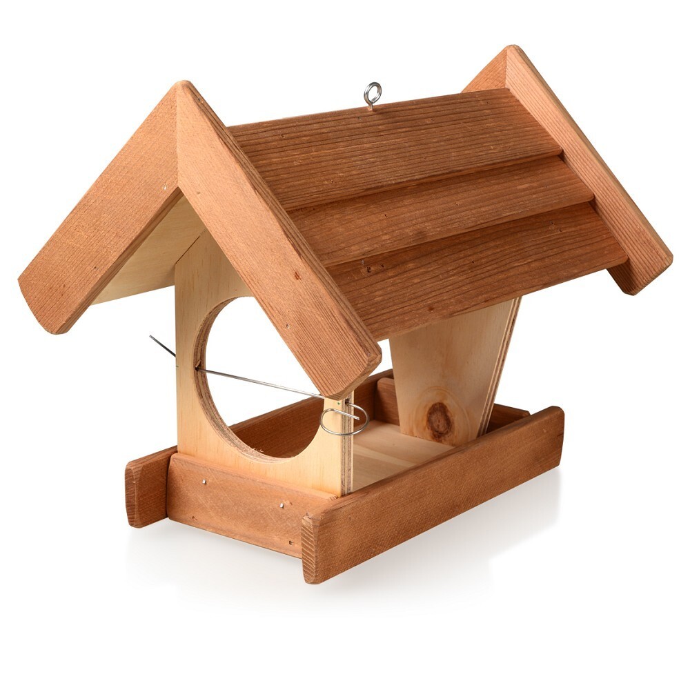Dřevěné krmítko pro venkovní ptactvo s napichovacím drátkem pro lojové pochoutky.
