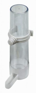 Napáječka na vodu/krmivo pro papoušky. Napáječka je uzpůsobena na připevnění na klec.Objem 125ml, velikost 14,5cm.