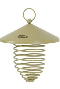 Závěsné kovové krmítko ve tvaru spirály, se stříškou, na lojové koule. Výška spirály 11cm.