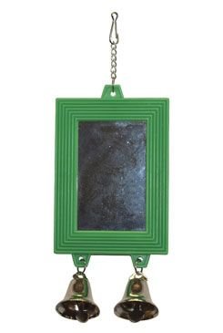 Zrcátko se dvěma zvonečky v plastovém rámečku je vhodné pro střední druhy papoušků (rozela, amazoňan a další).K zavěšení do všech klecí či voliér.Velikost: 12 cm