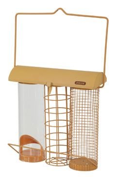 Závěsné venkovní kovové krmítko se stříškou a 3 samostatnými komorami na mix semen, lojové koule a slunečnicová semínka.