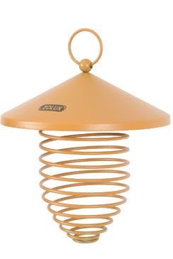 Závěsné kovové krmítko ve tvaru spirály, se stříškou, na lojové koule. Výška spirály 11cm.