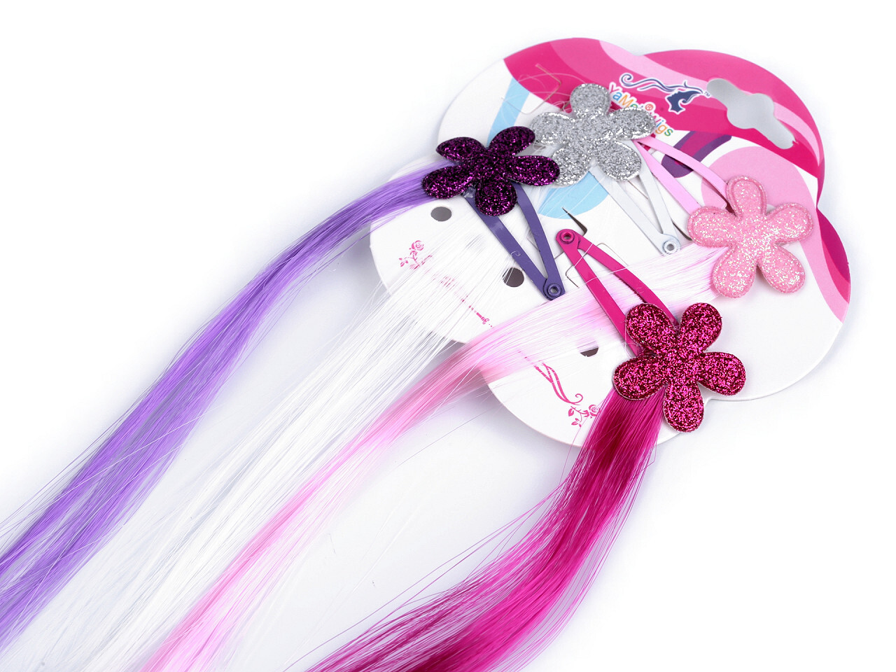 Sada barevných pramínků na pukačce potěší především malé holčičky. Jsou ozdobené textilními ozdobami s glitry, díky kterým se působivě třpytí. Pramínky skvěle oživí účes. Při dětské hře na princezny jsou neocenitelným doplňkem.Každý pramínek má jinou barvu. Pukačky dobře drží i na jemných vlasech.