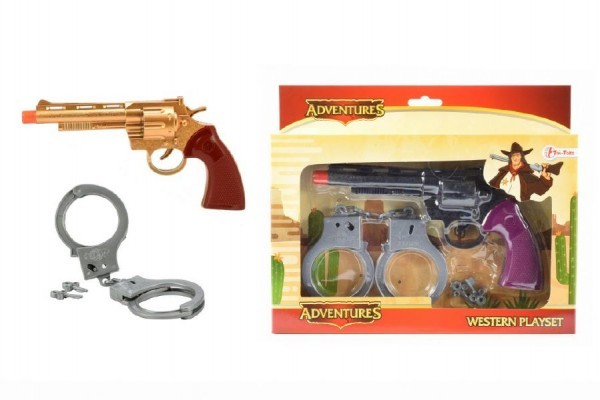 Pistole kovbojská + pouta plast 20cm, 2 barvy, v krabičce - 1 kus
