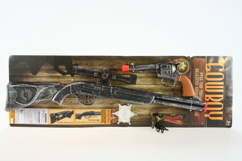 - Obsah sady: plastová puška se zaměřovadlem, pistole, odznak šerifa, a přívěsek.