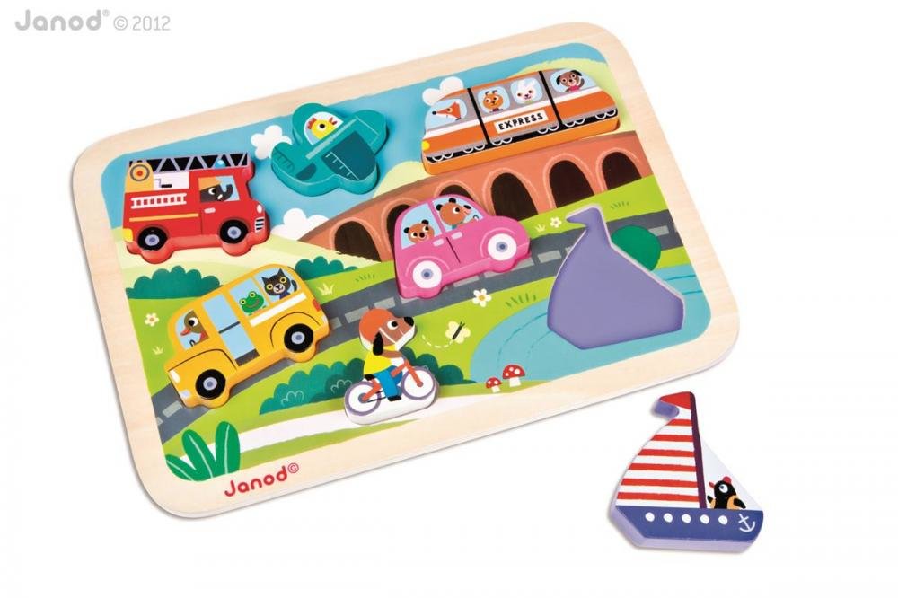 Ví vaše děťátko jak vypadá loďka, autobus, čí vlak? Rozezná je podle tvaru a uloží na správné místo? Nádherně ilustrované dřevěné vkládací puzzle s motivem dopravních prostředků je skvělým dárkem pro vaše nejmenší ratolesti. Puzzle je vyrobeno z masivního dřeva a proto snadno uchopitelné pro vaše dětičky. Puzzle je vhodné pro rozvoj jemné motoriky, učení se barev, pojmenování a rozpoznávání objektů, či zvířátek.