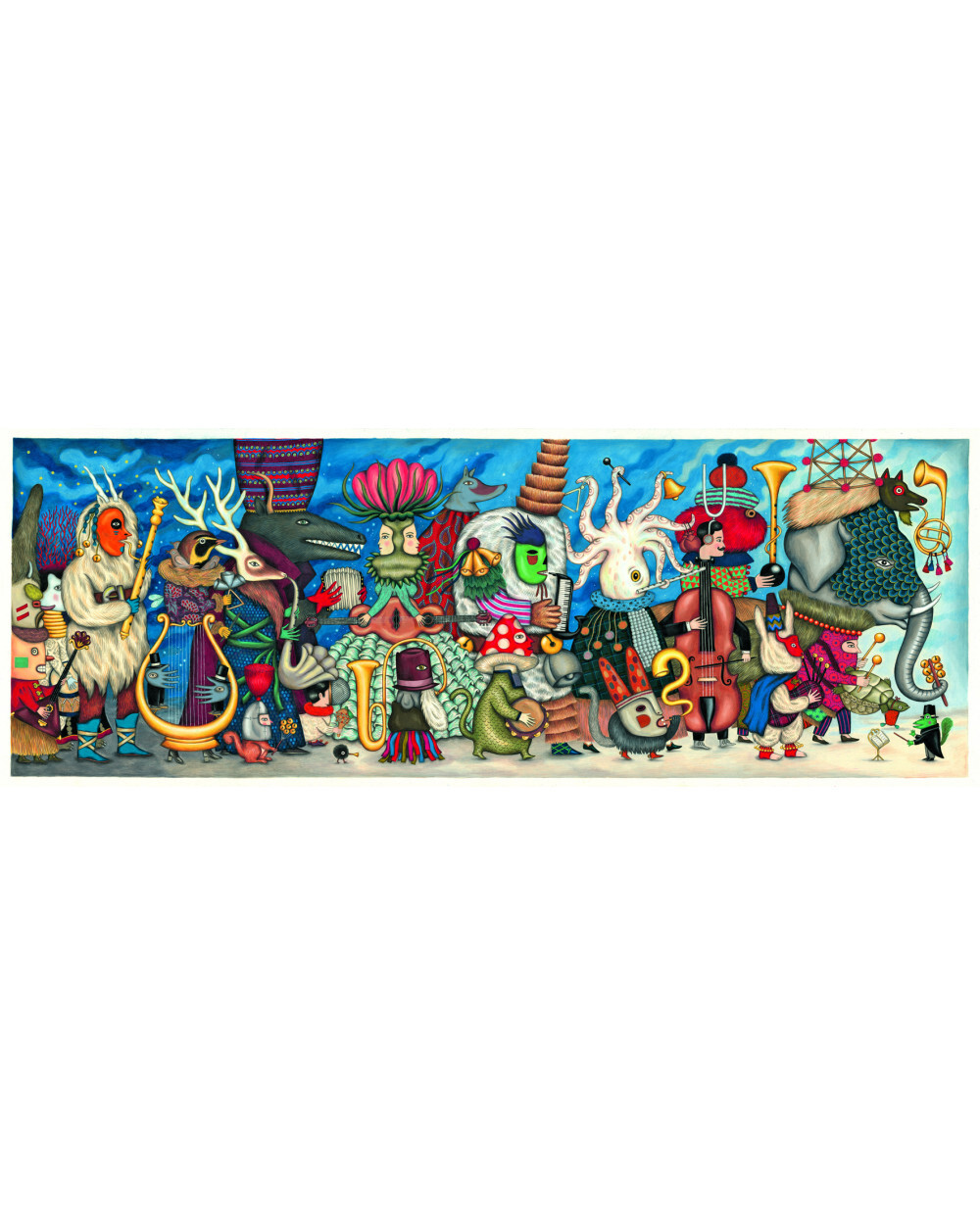 Nádherné ilustrace francouzských výtvarníků pohladí duši každého umělce. Sestavte si dlouhý obraz nádherného orchestru, kde najdete všechna možná i nemožná zvířátka. Puzzle rozvíjí dětskou představivost, trpělivost a jemnou motoriku.