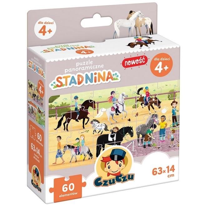 Długa panoramiczna układanka przedstawia to, co dzieje się w słonecznej stadninie.Zabawa doskonali małą motorykę, spostrzegawczość i wyobraźnię.Zestaw zawiera 60 elementów.Wymiar układanki to 63 x 14 cm.Duże elementy są wykonane z trwałej tektury.wiek: 4+ číst celé