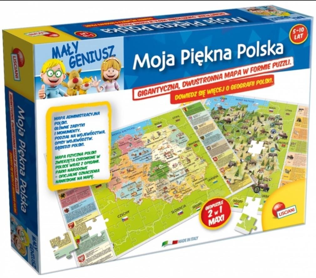 Zestaw zawiera puzzle dwustronne o formacie 70x50cm po złożeniu. Puzzle przedstawiają mapę administracyjną Polski, podział na województwa z ich opisem, stolice województw, główne zabytki danego regionu, najważniejsze zwierzęta znajdujące się pod ochroną, główne rzeki oraz parki krajobrazowe.