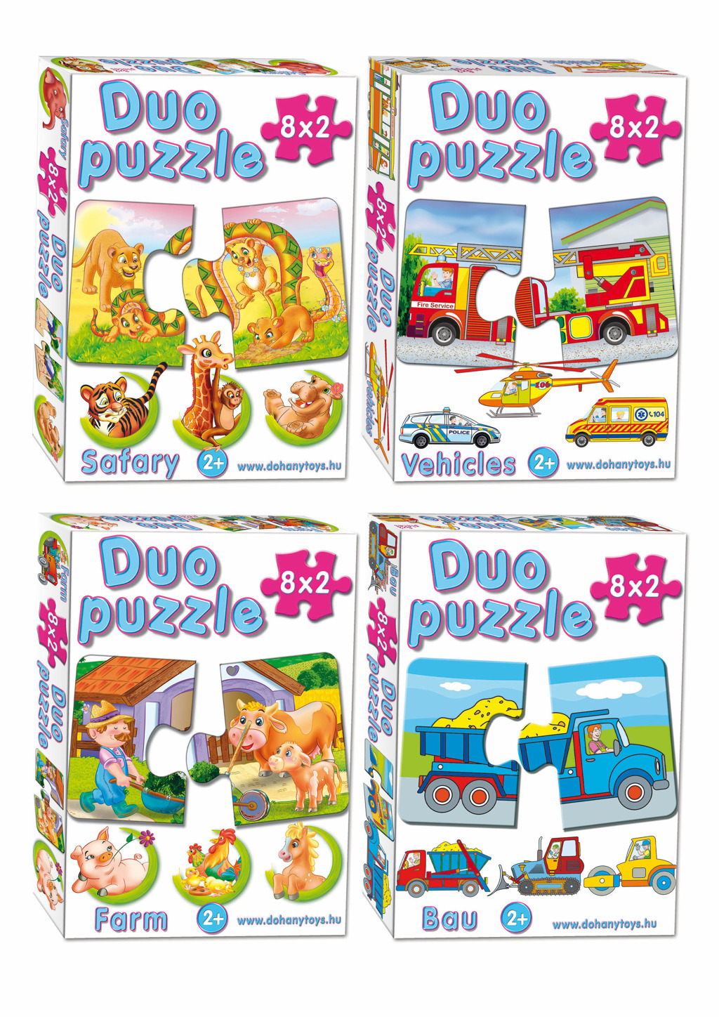 Puzzle Duo 8v1 - safary/doprava/stavitel/farma. V každém balení 8 obrázků k tématu. 2 dílky.Vyrobeno v EU.