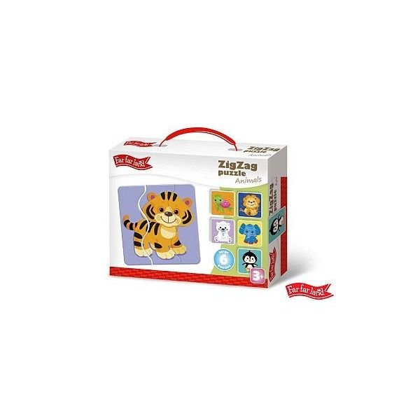 Far Far Land Puzzle ZigZag, motiv zvířátka. Balení obsahuje 6 puzzle obrázků. Barevné obrázky a speciální klikaté stříhání dodávají hře více zábavy. Tato hračka rozvíjí logiku, motoriku, kreativitu a koordinaci ruky a oka Doporučený věk. od 3 let číst celé