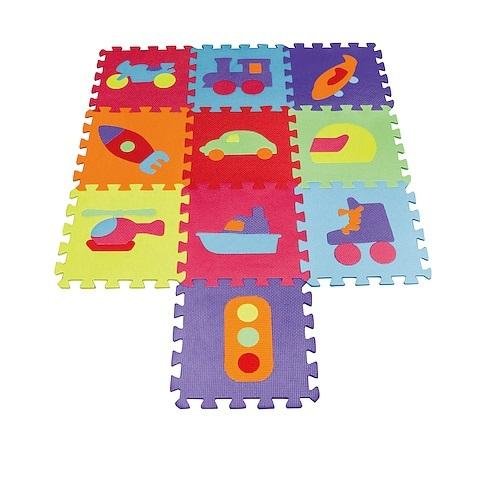 Układanka z pojazdami może być używana jako mata oraz jako puzzle do układania. Jest zrobiona z miękkiej pianki, miłej w dotyku. Może też posłużyć jako podkładka przy innych zabawach czy drzemce. Zabawka uczy: spostrzegawczości, rozpoznawania kolorów i kształtów, budowania figur przestrzennych, zabawy z wyobraźnią.