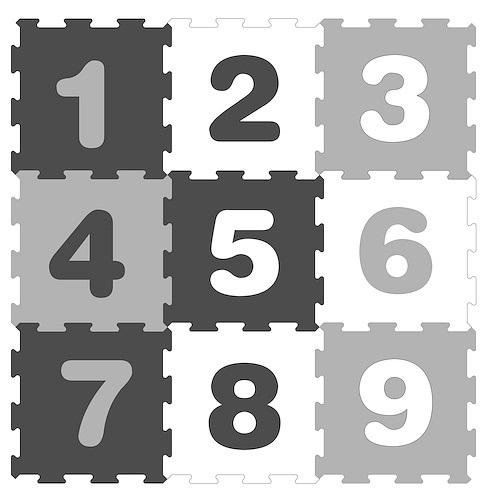 Trójkolorowa mata piankowa cyfry - czerń,biel i szarość, może być używana jako dywanik - podkładka na podłogę oraz jako puzzle do układania.