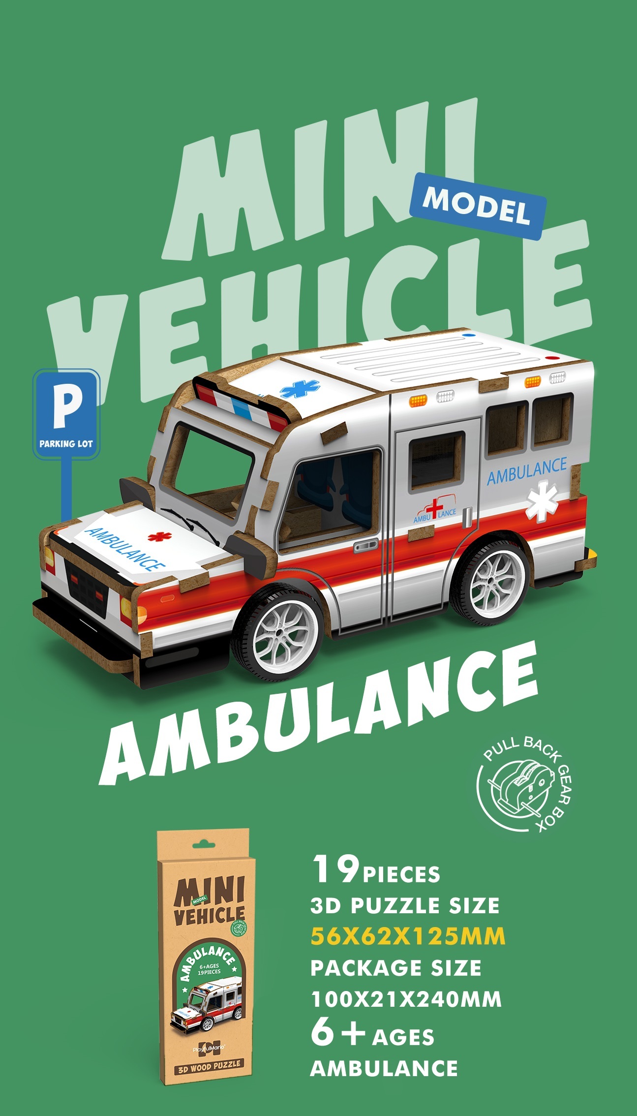 3D puzzle dřevěné - Sanitka. Rozměry 13x5,6x6,2 cm. 19 dílků. Na zpětné natažení. číst celé