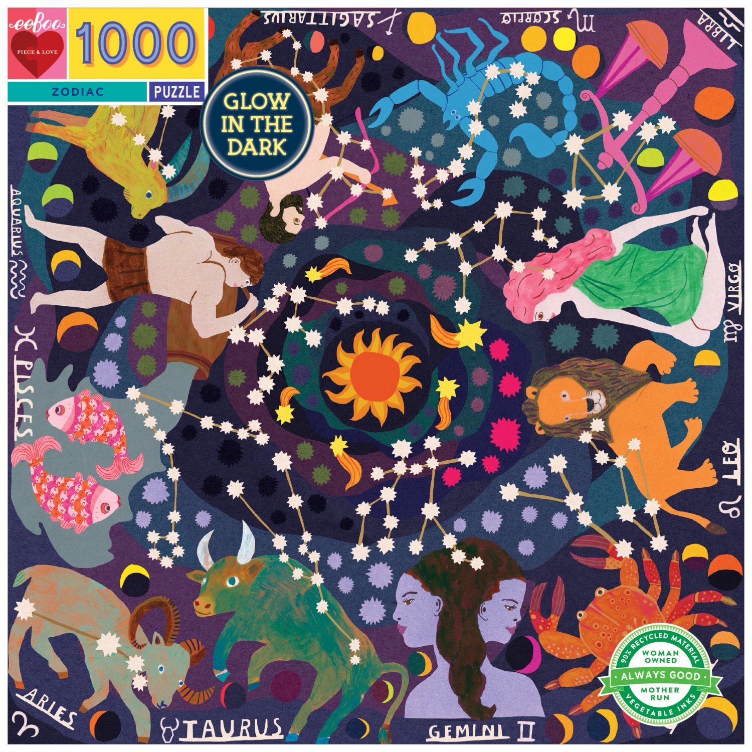 Puzzle, kde je je vyobrazeno všech 12 znamení a souhvězdí zvěrokruhu. Názvy zvěrokruhů, souhvězdí a symboly září ve tmě. Vyrobeno z 90% recyklovaného šedého kartonu a tišteno inkousty na rostlinné bázi. Puzzle od amerického výrobce EEBOO. Rozměr složeného puzzle cca 58,4 x 58,4 cm